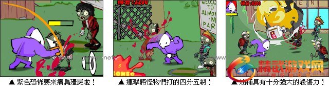 紫色恐怖这回要来挑战殭尸群了,面对不断涌入的殭尸们,主脚能否顺利解决牠们呢?游戏中有一堆绝技和招式,还有很多随手可得的武器,而游戏目的就是将沿途的殭尸打个片甲不留,快来一路闯关挑战高分吧!