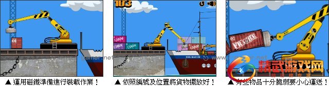 游戏操作:以滑鼠操作机械手臂移动,点击左键释放磁力吸住货物,再将货物运送到船上指定位置。