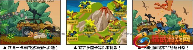 恐龙猎人要驾驶着卡车将恐龙蛋运往实验室里,确惹怒了恐龙族群,牠们将对卡车发出攻击。游戏中要小心恐龙出没,他们会将蛋搬走或用石头砸毁车子,利用车上的机关枪消灭他们,成功的将恐龙蛋送往实验室吧!