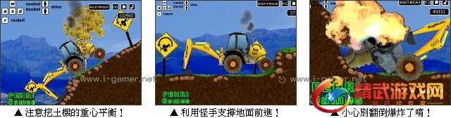 游戏操作:以键盘W、A、S、D键操作挖土机摇桿,上下方向键控制挖土机重心。