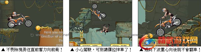 游戏操作:以键盘上下键操作摩托车前进后退,左右键控制重心,空格键加速,Ctrl 键转向,M 键地图。