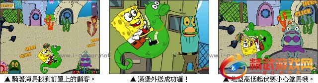 海绵宝宝来到了派大星的汉堡店打工,玩家必须要骑着海马外送汉堡。如果有客人没收到汉堡,派大星可是不会让你过关的。海底路途崎岖不平,稍不留意就会摔个四脚朝天哦!