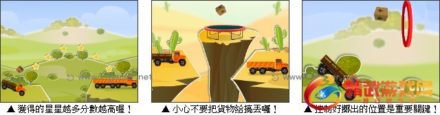 游戏中需要操作小货车前进,将所载的货物弹送到大卡车上,才可以算完成任务,但是中间有悬崖该怎么办呢?这款游戏不像是一般的卡车运送方式,而是要控制好小货车在丢出货物上时间点及位置,并利用各种物件来协助,才能顺利地把货物送到卡车上面喔!