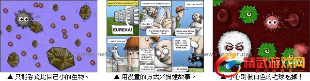游戏操作:以键盘方向键操作细菌移动,吞食体积比自己小的物体。