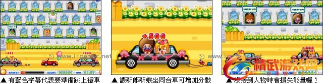 今天是小美的大喜日子,她实在太高兴了,所以急着要从窗户跳到礼车上,可是礼车会一直向前开,所以要靠玩家们控制礼车来迎接小美和两位新郎,千万要小心不要让小美摔伤啰!