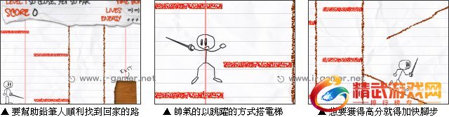 游戏操作:以键盘左右方向键操作铅笔人移动,上键跳跃,空白键攻击。