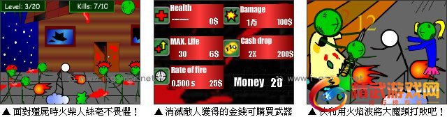 火柴人的世界也面临着殭尸的入侵,但是火柴人学会了最新的绝技 - 火柴人冲击波,对恐怖势力无所畏惧。要消灭一定的殭尸数量才能过关,关卡总数为20关,每关结束后可以进入升级页面,购买和升级各种能力,让我们一起挑战殭尸大军吧!