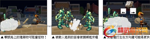 铠甲勇士遇到大批怪物追击,需要儘快逃脱请求总部的支援,千万别让怪物追到铠甲勇士哟。游戏中要操作方向键进行逃跑,并以摧毁路上的建筑物暂时阻挡怪物的追击,被追到可是会被捆绑起来喔!