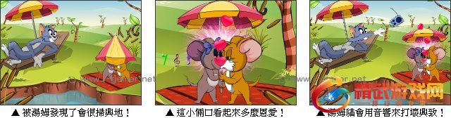 杰利鼠跟他的小女朋友在湖边约会,可是不巧的是牠的冤家汤姆猫也在附近乘凉,玩家必须要在汤姆猫不发现的情况下偷偷接吻成功,才可顺利过关喔。