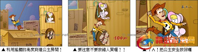 玩具总动员 3 这部电影想必各位网友都知道,现在推出了这款以玩具总动员为主题的游戏。游戏中胡迪警长为了救出被巨龙抓走的公主,需要利用绳索因摇晃而产生的弹力飞入房间内救公主。要注意公主随时会被带离开到不同的房间内,千万不要救错人质啰!