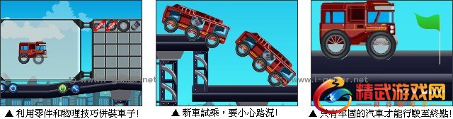 拼装车闯天关是要让玩家将几个简单的汽车零件,拼装出一辆坚固耐用的汽车,使它能顺利的行驶到指定的终点即可过关。游戏需要有物理原理与技巧才能拼装出强劲的汽车,大家快来动动脑吧!