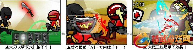 游戏操作:以键盘方向键前后右左控制主角移动,A 键控制攻击,S 键放忍者镖,数字键 1~5 选择武器。