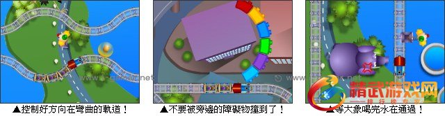 开心火车就快要出发启程啰,玩家驾驶的开心火车沿途会碰到很多的障碍,像是有小丑档在路中间必须要等到他离开了才能通行,还有突然飞出的火箭人也要小心不能被撞到了,画面下方有小火车的生命值,如果撞及次数太多后面的车厢就会掉下去,要好好保护开心火车直到终点喔!
