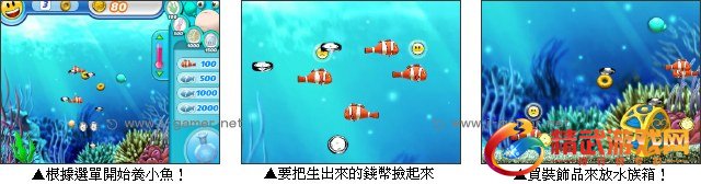 游戏操作:以滑鼠操作进行游戏,当水族箱中出现变异鱼的时候一定要马上用滑鼠点击来阻止牠移动,不然可是会吃光其他鱼的。