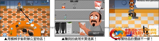 盗圣机械手在夜晚潜入了一间公司,想在这个夜晚偷光公司的物品,他可以顺利成功吗?游戏必须在时间内达成关卡的分数目标,过关后可以用得到的金钱来买道具使用,遇到其他的小偷跟你一起偷东西,还可以丢炸弹攻击他。
