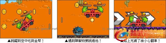 游戏操作:以键盘的左方向键以及右键来控制速度,方向键上跳跃,方向键下煞车,空白键可调头。