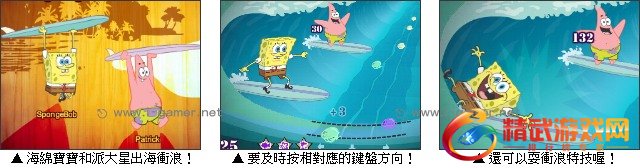 海绵宝宝玩冲浪当然是下很好的休闲运动,可是要注意别被浪给冲进海里。这回闲置了好久的帆板被派上用场了,海绵宝宝决定和派大星一块出海玩冲浪。画面右边的贝壳漂到下方两条波浪中间的时候要及时按相对的键盘方向,否则海绵宝宝会失去平衡哦!