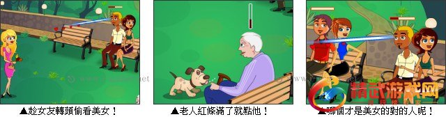 女主角约男朋友在公园见面,可是左等右等却都不见男友的蹤影,只看见其他一对对的情侣不断进来,心里真是不好受,于是他决定要勾引别人的男朋友,让这些男人心不在焉的盯着她看,小心别让他们的女朋友发现了,右下角有一个老人他会在旁边观察,当他头上的红色能量条快满的时候点他就好了。