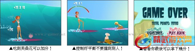 游戏中的女主角是个喜欢享受生活的人,这一天他来到了海边要冲浪,但是在海面上有许多漂浮物不能撞到,不然就会摔的四脚朝天,玩家们要操控好平衡感让女主角能够悠闲的沖浪喔,另外吃到水上的芙桑花可以加分还可以撞掉水上的漂浮物。