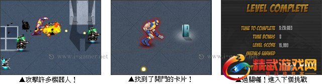 这是电影金钢狼的游戏,玩家必须要在关卡中消灭所有机器人,并且拿到过关的门卡或是必须物品才能过关,当失血过多的时候可以休息一下他会自动回复,关卡的难度会不断的提升,越玩会越觉得刺激有趣,快一起加入吧!