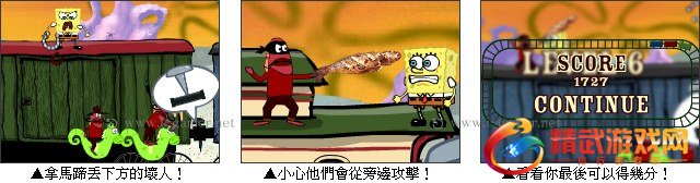 海绵宝宝这次任务是防卫画面中的火车,火车的下方会有骑着马要来攻击的坏人,他们会把火车拆掉,你必须要阻止他们,在海绵宝宝的头顶上会出现马蹄,你要跳跃吃到马蹄,接着用马蹄丢下方的坏人,小心有的坏人会从天空降落攻击你,这时候只要跳跃把他採死就可以啰!