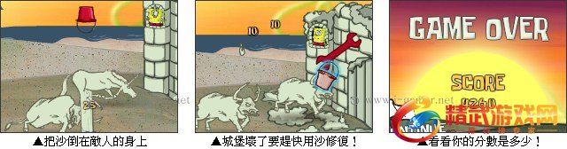 海绵宝宝在玩堆沙,好不容易用沙子堆起了一作城堡,可是前方却来了好多也是用沙子做的牛和马攻击,你要用水桶接住天上的雨水,装满了就到在敌人的身上,他们就会毁掉而且你也会增加一个士兵,如果城堡已经毁损了装满水倒在城堡上就可以修复啰!