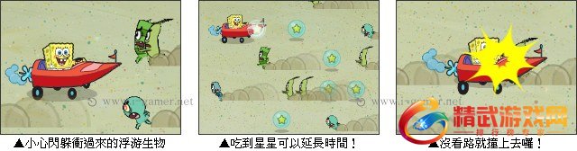 有一天海绵宝宝心情很好开着车出去兜风,不料却碰上一群正在逃命的浮游生物,你必须要帮助海绵宝宝闪躲这些浮游生物,在途中你还要收集许多星星可以延长时间,如果不小心被撞到就会被扣时间,试试看最后你能得几分吧!