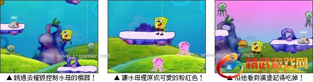 游戏操作:以键盘方向键键操作海绵宝宝移动方向,吃汉堡避开蓝水母,跳到每个控制水母的机器上摧毁它。