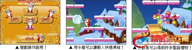 在愉快的圣诞节中圣诞老人正在準备礼物,却突然出现许多来破坏圣诞的家伙,玩家赶快帮助圣诞老人用水枪去冻结敌人,但是敌人会渐渐从冰块中挣脱,所以冻结后还要过去踢一下才可以完全把敌人消灭。 ~ 本游戏由网友 书维 推荐。