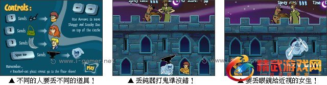 这是一款趣味游戏,玩家必须引导史酷比与牠的主人同心协力在城堡上打鬼,同时还要帮助城堡内求助的人。打鬼时别打到求救中的妇女喔!