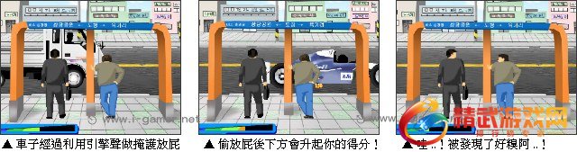 偷放屁是一款相当搞笑的另类搞怪游戏,主角在等公车时内急,玩家的任务就是帮他偷放屁但是不能被一旁的人发觉。可别以为游戏很简单,主角放屁的声响可是不小喔。当路上有车子经过的时候,赶紧利用引擎声做掩护帮他一股作气的放屁吧,喔!好畅快 ~ ..