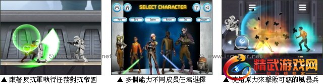 游戏中,玩家将可选择出现在动画中的各个角色,每个角色都有其特性与擅长的点。身手灵活善用原力的艾斯纳、射击技巧高超的希娜甚至是维修机器人小铁都可以自由选择使用,每一个关卡需要达成的目标也都不尽相同,关卡精彩多变,热爱星际大战的玩家们,可不要错过这个作品唷!