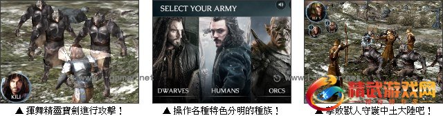游戏中玩家可以选择精灵、矮人、人类,甚至是邪恶的半兽人来进行作战,目的只有一个,就是将孤山的宝藏占为己有,游戏以 Unity3D 引擎制作,呈现出完整战争庞大的景色,让玩家能够深入其境的享受魔戒的世界!