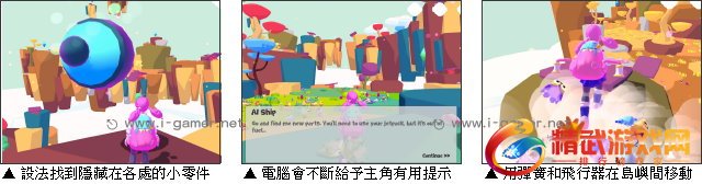 为了顺利在漂浮的岛屿间移动,玩家除了可以利用架设在各处的弹簧板来跳跃,还得倚靠身上的飞行器来控制移动!不过这飞行器虽然能力强,但要消耗的能量也多,在无法获得足够燃料的情况下,潘在电脑的建议下决定使用这些可爱的外星生物来代替,伸出管子尽量收集直到充满,再利用喷出生物们所产生的后座力来前进吧!随时留意剩余的数量,一旦变得过少就得要即时补充,否则没能找好落点掉到岛下,潘可就要瞬间重来喽!另外,除了某几个零件能够直接获得,有些还拥有特殊防护,潘需要先利用喷射生物来击碎附近的能量石才能关闭,玩家在移动时可要多多留意周围喽!