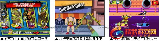 历久不衰的忍者神龟!无论是哪个世代的玩家,对于这些身手矫健的神龟们想必都有属于自己的回忆吧?这次的《忍者神龟全世代》将带玩家一块时光倒流,游戏中提供了 5 款从黑白的 1984 年到不仅彩色甚至还立体的 2014 年忍者神龟小游戏,多样的游戏方法,迥异的画风,不变的是我们热爱的忍者神龟,还在等什么呢?快来一起回味体验吧!