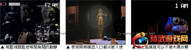 在这期间玩家只可以进行简单操作,藉由不时坏掉的闭路电视的监视器去观察整间餐厅,阻止恐怖人偶进入。每具人偶都有其独特移动方式,并会因为玩家操控闭路电视的动静而入侵,而有些房间没有灯光,玩家可以使用手电筒照明确认,但要注意,电力可不是无限的噢。每成功度过一天,木偶就会变得更加残暴。在恐怖的午夜店铺内渡过五个晚上,你能熬过来吗?快来挑战一下吧!