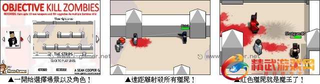 乐高殭尸游戏可以单人玩也可以双人玩,画面很有乐高的风味,玩起来不会觉得太血腥,游戏开始前要先选好你的角色接着再选择场景,然后开始进入游戏攻击迎面而来的殭尸,路上会有很多的红色小方块吃可以加分,等级提升就可以开启下一种武器,红色殭尸出现他就是魔王,打败他进入下个关卡。