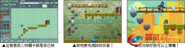 玩腻了一成不变的冒险游戏了吗?现在你就可以自己来制作,从背景到人物还有关卡的摆设通通都是可以自己完成的喔,跟着提示首先要选择游戏场景,接着是人物,再来可以运用你的创意摆设路障、钻石、毒蛇...等等物品,做完后先自己测试玩一遍,最后还可以将游戏上传壤别人玩喔。