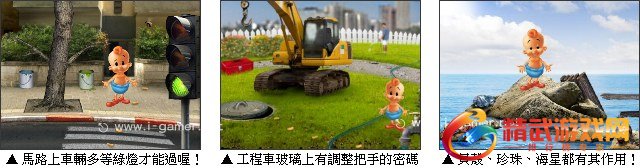 第一关:让松鼠把饼乾偷走。下一个画面把右边的树枝折断,接着点蜜蜂让牠飞去叮油漆工人的同时,用树枝把梯子上的红色油漆勾下来。取车上的橘子沾红漆,再利用左边树枝的弹力把水果丢向红绿灯,变红灯后即可过马路。