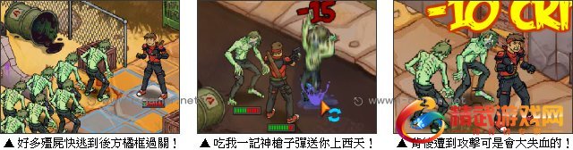 游戏操作:以滑鼠操作进行游戏,点击绿色方块移动位置,点击主角选择攻击或者防御,选择武器攻击时,在武器範围内的殭尸都可以攻击;游戏画面可以拖动。进入游戏关卡前可以为主角升级。