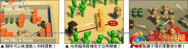 游戏中玩家要帮助主角在封闭空间内,利用障碍物使子弹疯狂反弹,让这些失去方向的流弹消灭大量敌人,或是抓準时机,将恰好排成直线的三名敌人一次击杀吧!不过要注意的是,你的对手可不会呆呆的等着你攻击,随时留意对方动向,灵活的闪避反击也是一个重点唷!一旦中枪或是碰触到一边的仙人掌,我们的枪手可是会直接跟你说掰掰的!