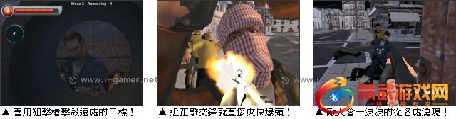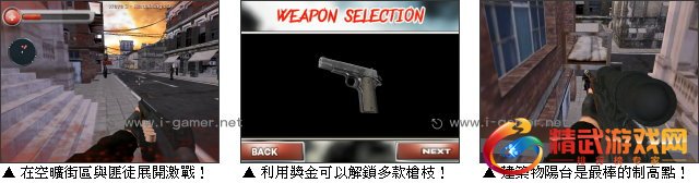 除了开始配备的基础手枪,玩家还能够透过完成战役来赚取奖金解锁杀伤力更强的来福枪或是狙击枪等!虽然活动範围有限,但设计者还是精心的準备了夺目的日落或是寂静的星夜作为背景,使玩家随着游戏进展而能感觉到时间的流逝唷!而众多庞大的建筑物更是不能错过的重点,只要有入口,玩家就可以随意的进入并且上下楼找寻有利的地理优势,轻鬆的处理掉来袭的匪徒啦!準备好和这名精实的退役特种兵并肩,把雷达上显示的全部红点目标,无慈悲的全数击杀了吗?现在就将枪上膛,立刻出发吧!
