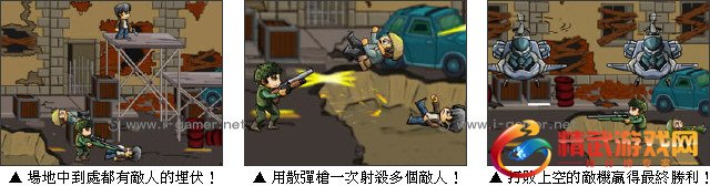 游戏操作:以键盘方向键 ←→ 控制人物移动,↑ 键枪口向上,↓ 键蹲下,D 键射击,S 键跳跃,空白键扔手雷。