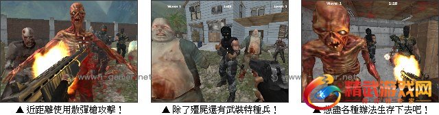 身为殭尸赶死队的一员,你必须将所有出现的殭尸全数击毙,善加利用环境的瓦斯和汽油桶来引发大爆炸,要注意在过程中不只是殭尸会出现,还有敌方的陆战队员会对你进行攻击喔,赶快拿起你手上的枪械将他们通通消灭吧!