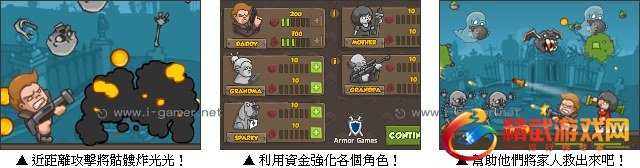 原本和乐融融的家庭突然遭到恶魔的偷袭,不管是小孩还是爷爷奶奶都被抓走了,身为爸爸的你决定带领剩下的成员们抵抗恶魔,并将被抓走的人救回来。玩家在游戏过程中会遇到殭尸、骷髅等怪物进行攻击,你必须抢先将牠们通通击毙,否则被攻击受伤过重就要回到起点开始前进,一路上如果看到被绑起来的家人记得解放他们喔!