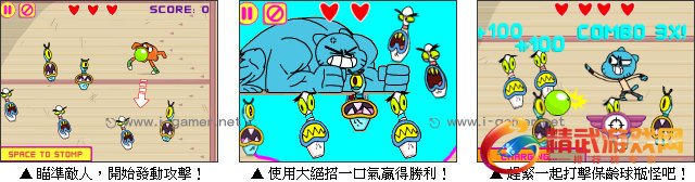 阿甘妙世界总会碰到层出不穷的趣事,这次他们在玩保龄球的时候,竟然到一群变异的球瓶怪朝向他们攻击,现在就让我们一起来帮助他们吧。游戏开始玩家可以选择自己喜爱的人物,保龄球瓶怪会随机出现,必须利用保龄球将他们全部击倒,分数达到一定的标準才能前进下一关,过程中还可以使用大绝招一次将敌人全部击败喔!