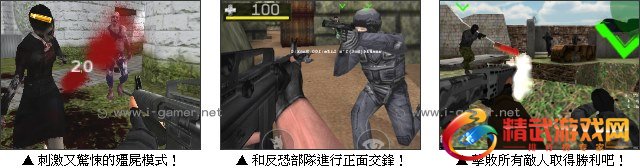 游戏载入完成后,点击【single player】,可以选择【classic】经典模式、【Team Death Match】团队死斗模式、【Zombie Survival】殭尸生存模式以及让电脑互斗的【Bot Match】电脑混战模式。如果嫌一直打电脑太无趣的话,点击【multi player】则可以和国内外的玩家一起合作对战,你可以在激烈的枪战中获得很多成就感,CS 迷快来亲身体验吧!