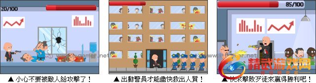 一群匪徒冲进摩天大楼,绑架里面所有的人,连员警都无能为力,把全部的希望寄託在了特务史密斯的身上。精明勇敢的史密斯决定挺身而出,单枪匹马去解救所有的人质。沿途必须尽快抢救所有的人,并且瞄準歹徒攻击,将他们全数打倒后,才能顺利过关喔。快和史密斯一起解救所有的人质吧!