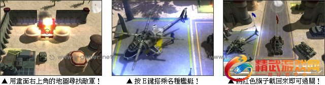 游戏操作:以键盘 W、A、S、D 键操作移动,滑鼠左键瞄準射击,E 键搭载交通工具,空白键切换武器,Esc 键暂停游戏。成功地炸毁敌人的主基地,并用吉普车把红色旗帜搬回我军基地即可进入下一关。
