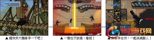 游戏操作:以键盘←→方向键操作移动,↑或空白键跳跃,↓下蹲。滑鼠瞄準射击,R 键装子弹,Q / Shift 键切换武器。↓键可使用盾牌(需选择护盾类型),E键使用技能(需消灭足够的敌人,右下方显示需消灭的敌人数量)。
